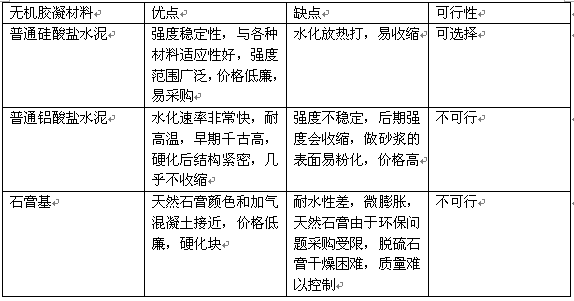 按比例準(zhǔn)確計量稱取各種原材料,在攪拌機(jī)中依 次加入填料砂、無機(jī)膠凝材料、礦物填料和外加劑充分 攪拌均勻,形成低密度蒸壓加氣混凝土專用修補(bǔ)劑。施 工時,按照水:修補(bǔ)劑為1:3的比例混合,攪拌3~5 min后使用,操作時間控制在2 h以內(nèi)。 3結(jié)果與討論 3.1無機(jī)膠凝材料的選擇 對各種無機(jī)膠凝材料優(yōu)缺點(diǎn)進(jìn)行了分析,見表1。