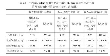 如上圖所示,加氣磚砌筑的墻體厚度與二氧化碳的排放量息息相關,或者說墻體的厚度與排放量成反比,加氣磚墻面厚度越高,反而使用中越環保。雖然36.5厘米加氣磚墻在生產中原材料使用要大于標準強和24厘米墻體,但其在使用階段幾個主要指標上要優于后兩者。例如原理消耗一欄中的使用階段,36.5厘米厚加氣磚數值為178.64千克,,24厘米厚加氣磚為236千克,標準強為231.45千克。三者差距明顯。